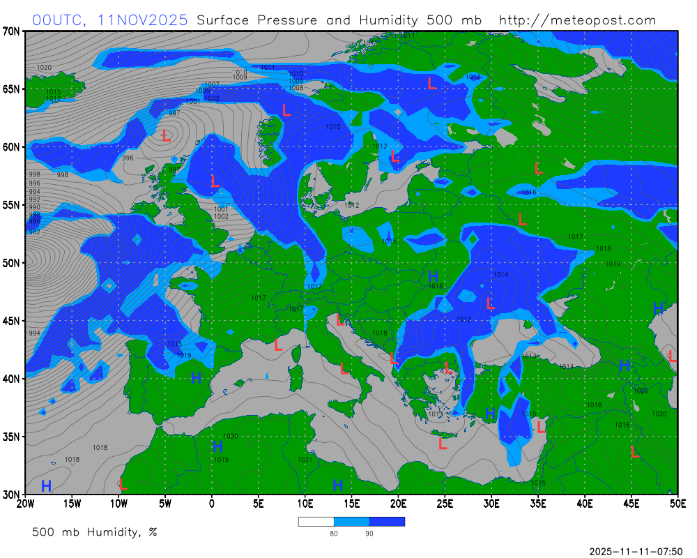 На карті: атмосферний тиск (приземний) і відносна вологість повітря на висоті 500 мБар (h = 4.5 км). Мапа оновлюється 4 рази на добу. Зони високої вологості на висотах допомагають визначати лінії атмосферних фронтів.