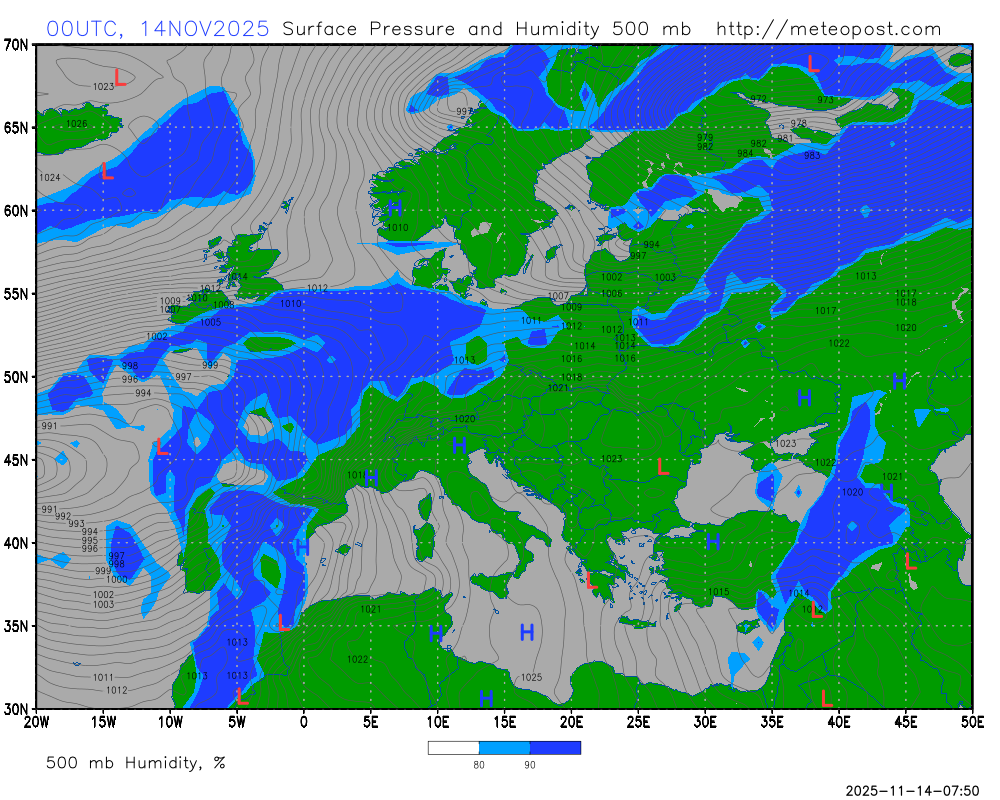 На карте: атмосферное давление (приземное) и относительная влажность воздуха на высоте 500 мБар (h=4.5 км). Карта обновляется 4 раза в сутки. Зоны высокой влажности на высотах помогают определять линии атмосферных фронтов.