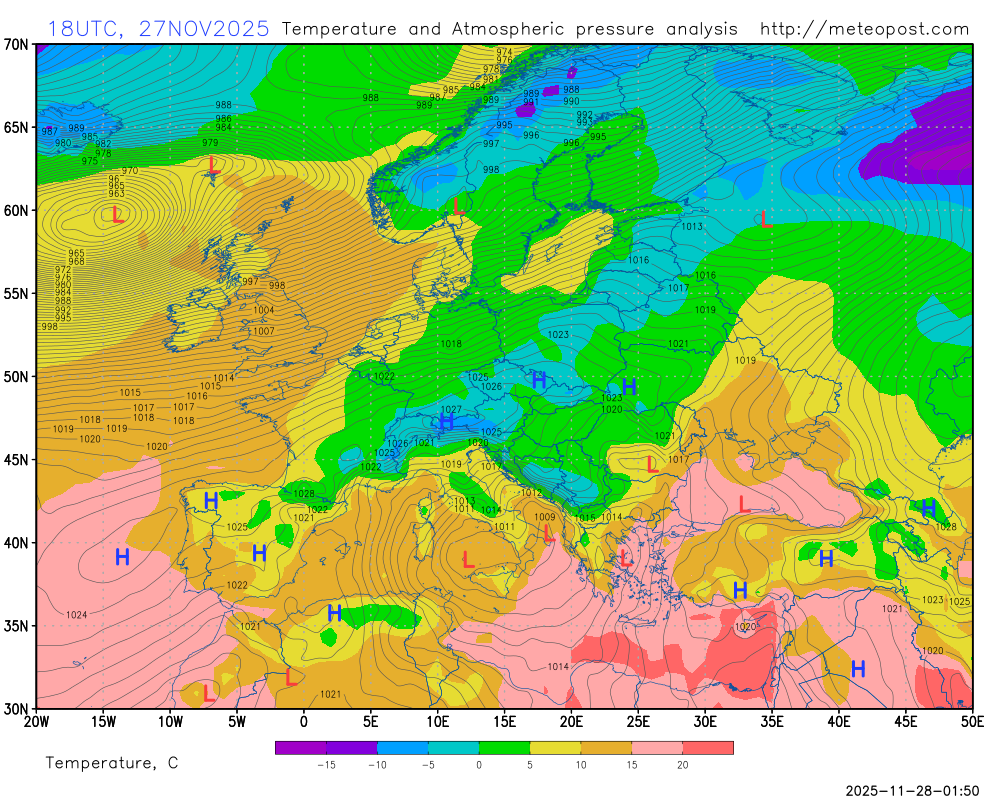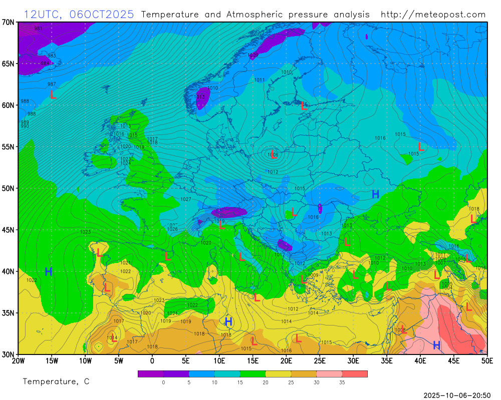 Карта приземного давления и температуры в Европе (анализ)